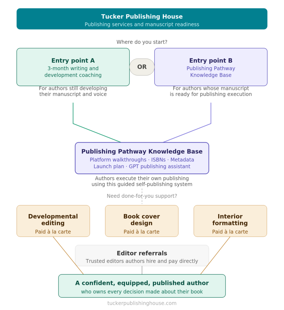 Tucker Publishing House is a publishing services company. We specialize in manuscript readiness and author preparation — the foundational work that determines whether a book succeeds long before it reaches a platform. We make sure you and your book are genuinely ready to publish — and then we equip you to do it with confidence in the marketplace.